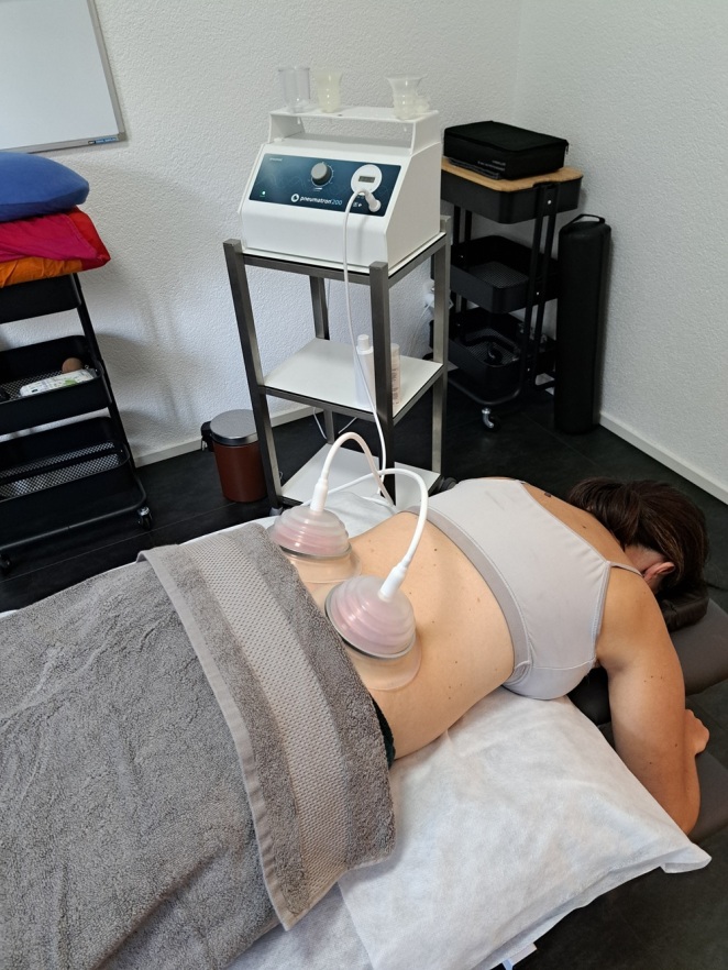 Der Pneumatron nutzt pulsierenden Unterdruck, um eine rhythmische Saugmassage zu erzeugen – etwa 200 Mal pro Minute. Die Behandlung lockert Muskelverspannungen, mobilisiert Faszien, regt Stoffwechsel sowie Lymphfluss an und kann auch der Narbenpflege dienen. Sie wirkt tief, ist schmerzfrei und frei von Nebenwirkungen wie Hämatomen. Die Intensität lässt sich individuell einstellen. Die Therapie eignet sich bei akuten und chronischen Beschwerden des Bewegungsapparates, Schwellungen, Faszienproblemen und auch zu kosmetischen Zwecken. Sie kann einzeln oder ergänzend mit anderen Methoden angewendet werden.